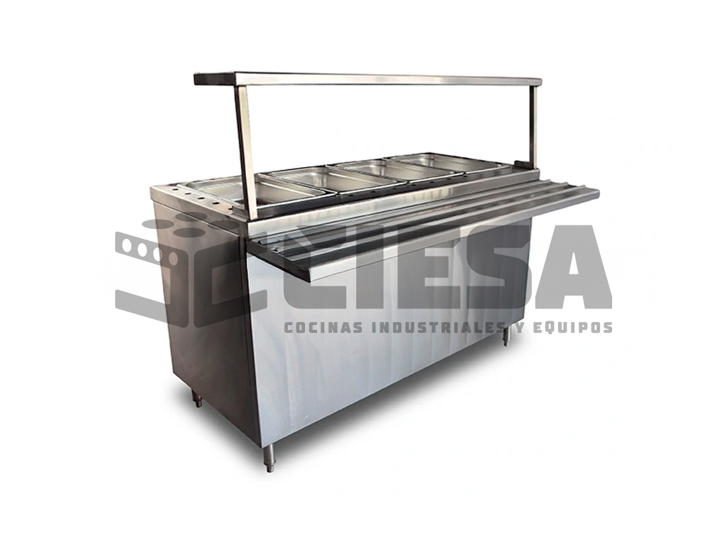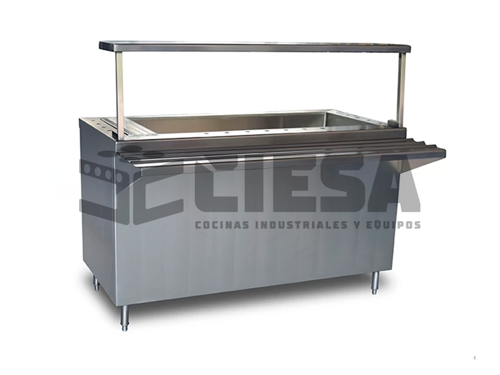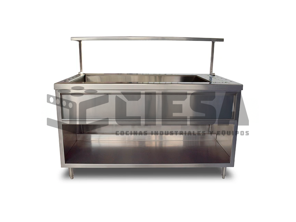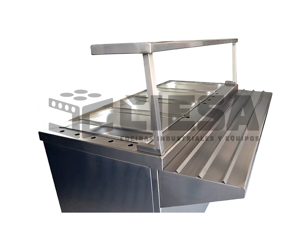 Fabricado en acero inoxidable calibre 18 y 20, cuenta con acabado sanitario, repisa deslizadora de charolas y regatones niveladores. Su diseño incluye una repisa contra estornudos, garantizando higiene y seguridad. Perfecto para banquetes, buffets o servicios de catering, este baño maría combina funcionalidad y durabilidad.