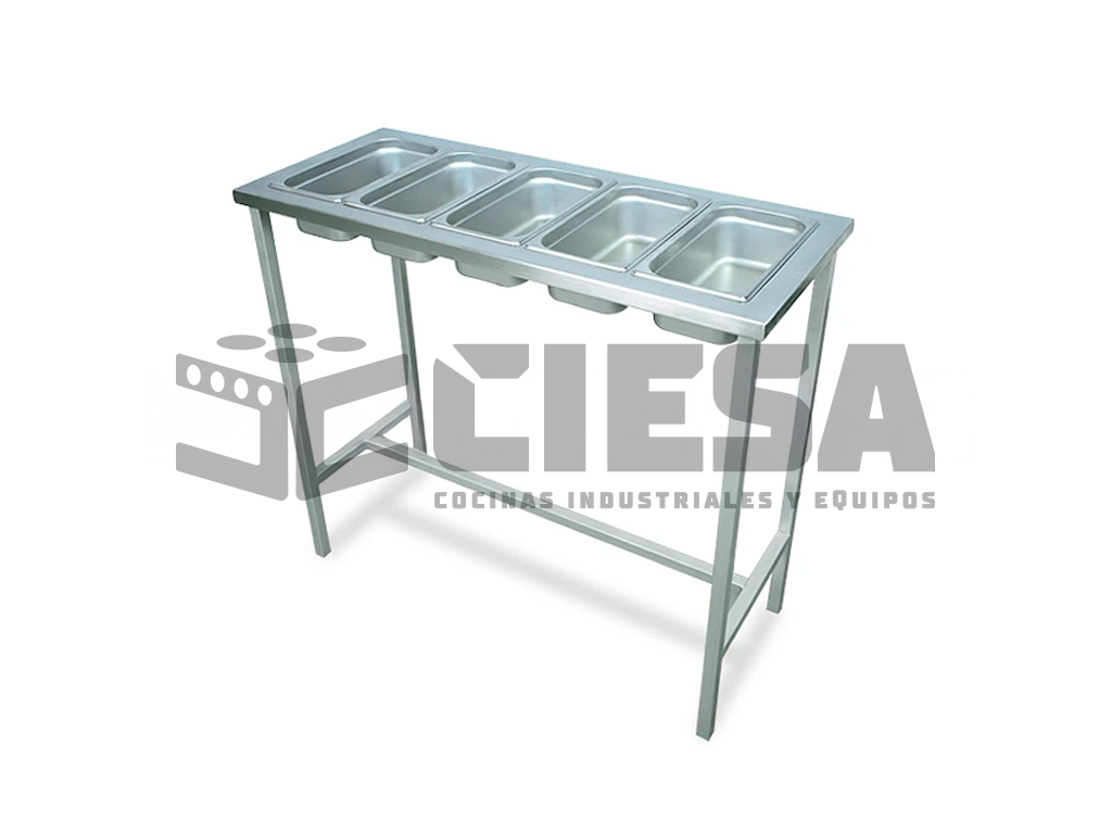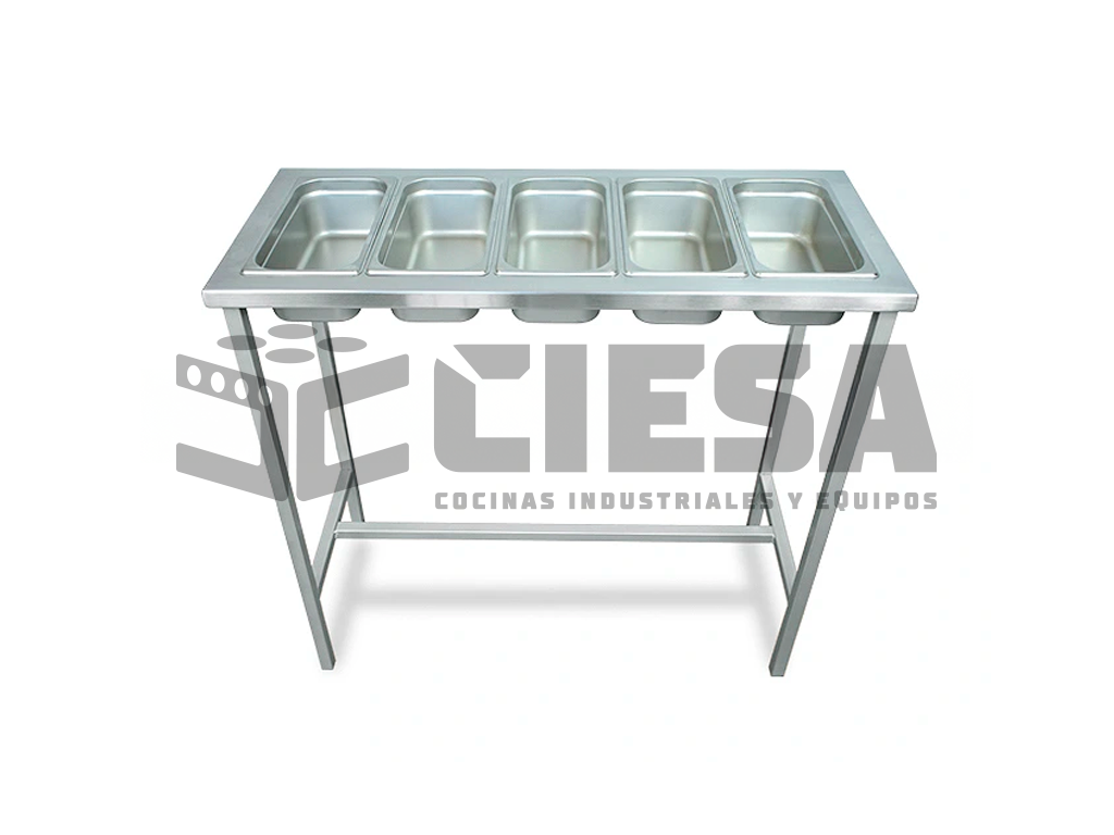 Barra Portátil para Ensaladas Económica BPEE Cubierta fabricado en lámina de acero inoxidable. Base estructural esmaltada. 5 insertos.