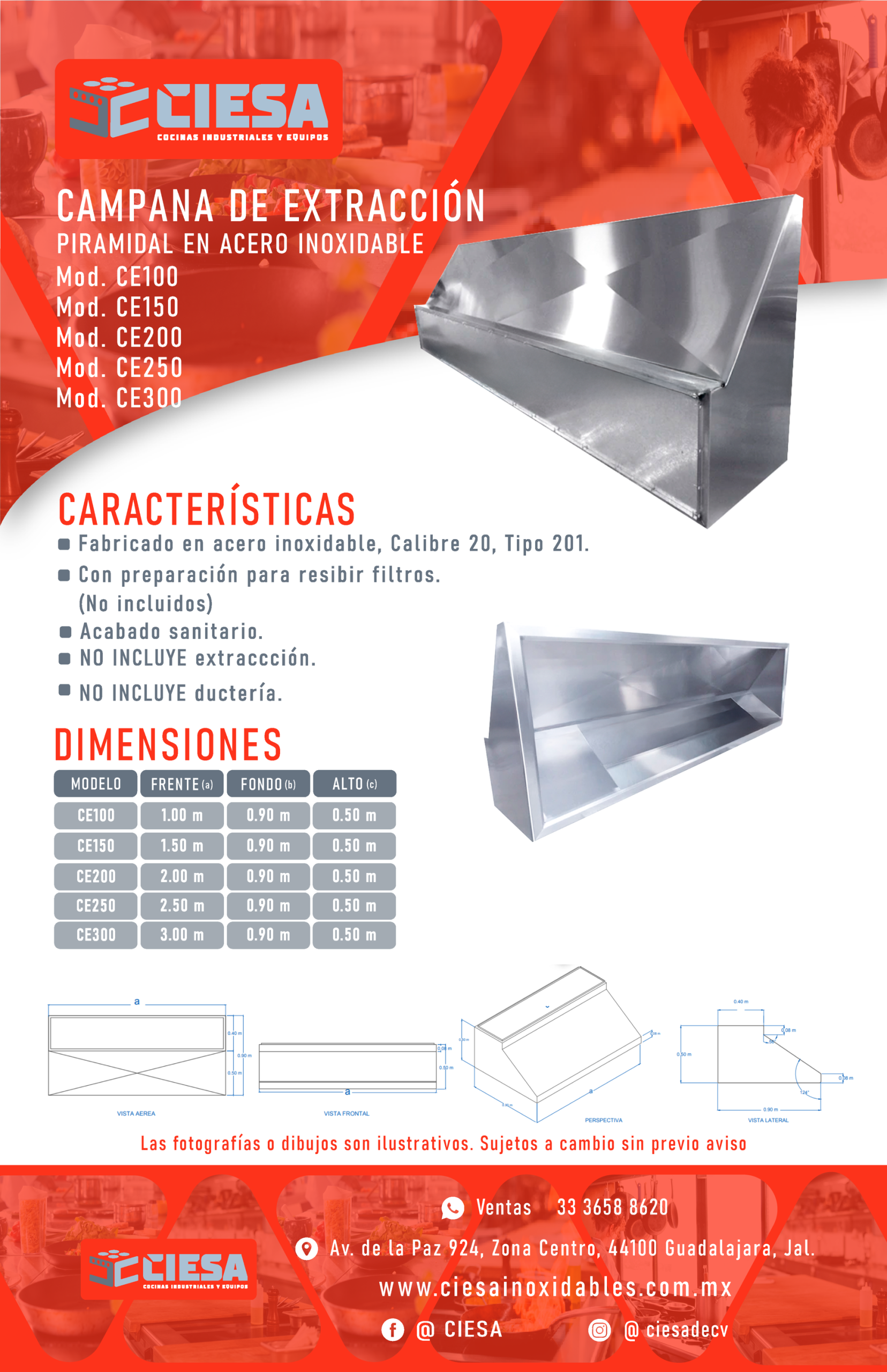 Campana de Extraccion Tipo Piramidal Fabricada en Acero inoxidable con preparación para recibir filtros(No Incluidos)