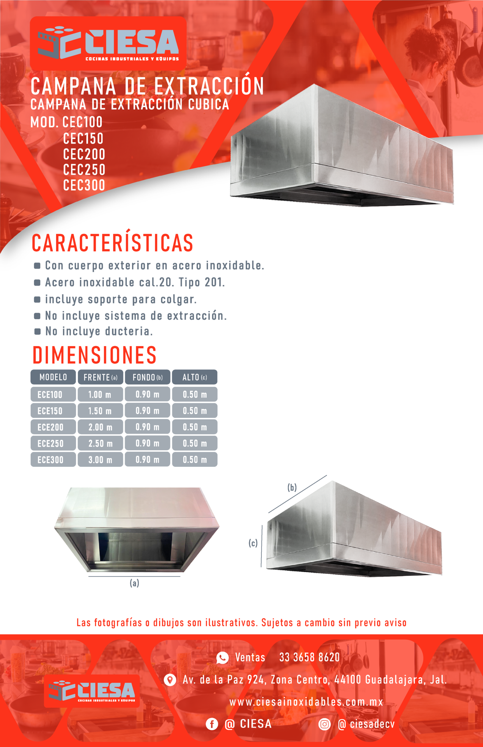 Incluye soportes para colgar y cornizuelas en acero inoxidable. No incluye sistema de extracción ni ductería.