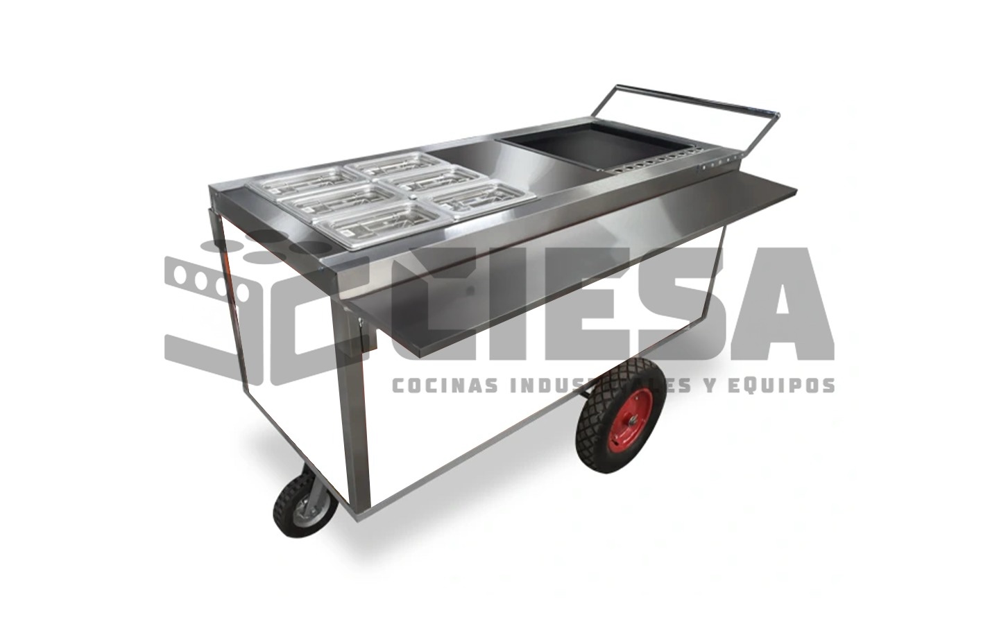 Lleva tu negocio a donde quieras con este carrito térmico profesional, ideal para la venta de tacos de guisado. Fabricado con cubierta de acero inoxidable, ofrece resistencia, higiene y durabilidad para el trabajo diario.