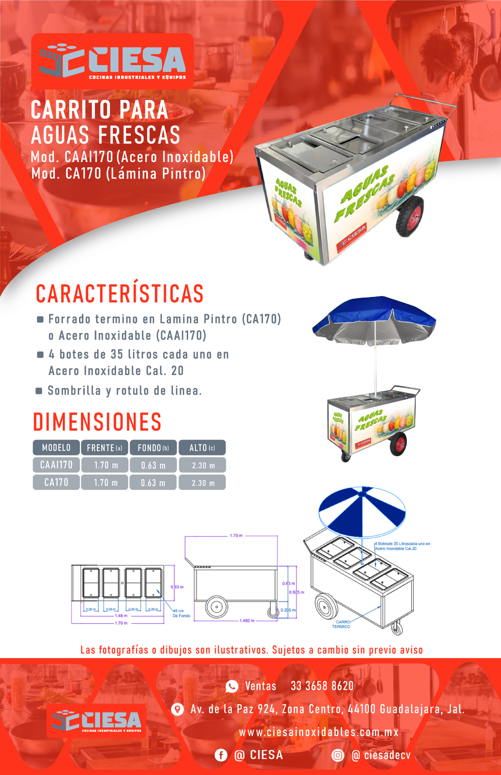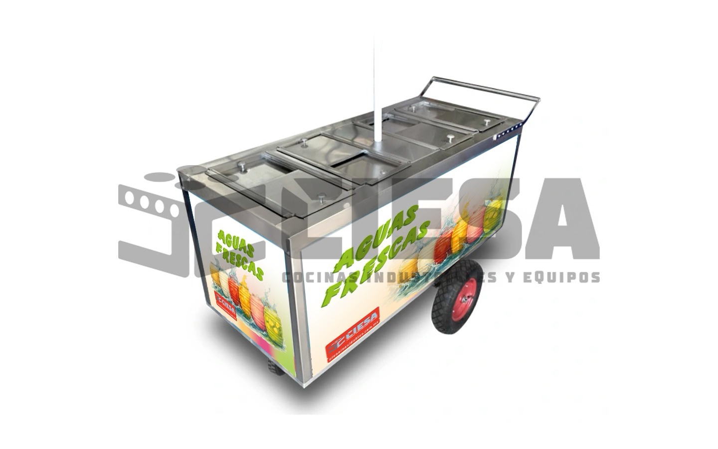 Mantén tus bebidas siempre frescas con el Carro para Aguas Frescas. Cuenta con 4 botes de 35 L, cubierta en acero inoxidable, forrado térmico, rótulo llamativo y sombrilla ajustable. Resistente y listo para tu negocio.