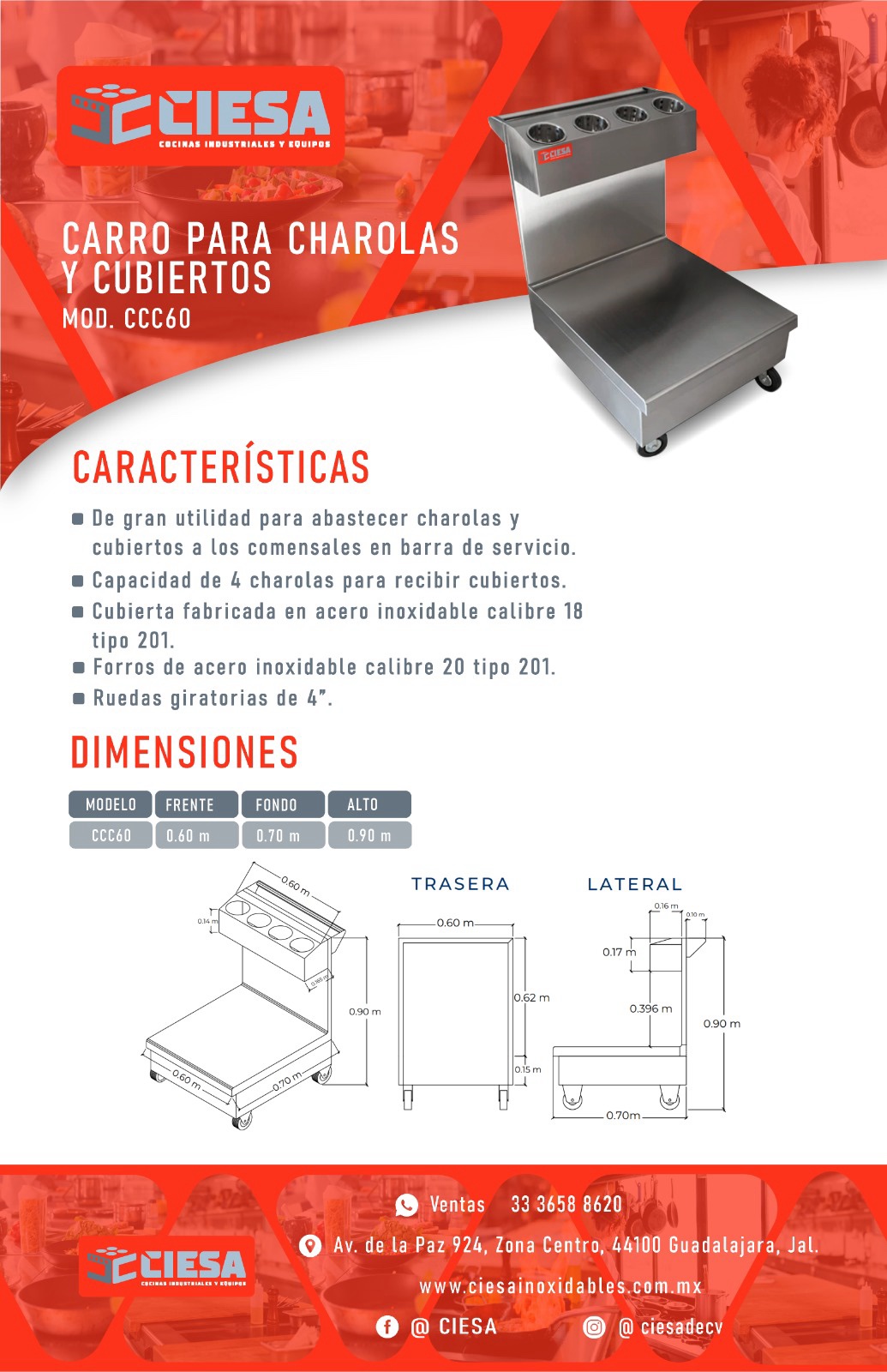 Carro para Charolas y Cubiertos Fabricado en Acero Inoxidable Cal. 18 y 20