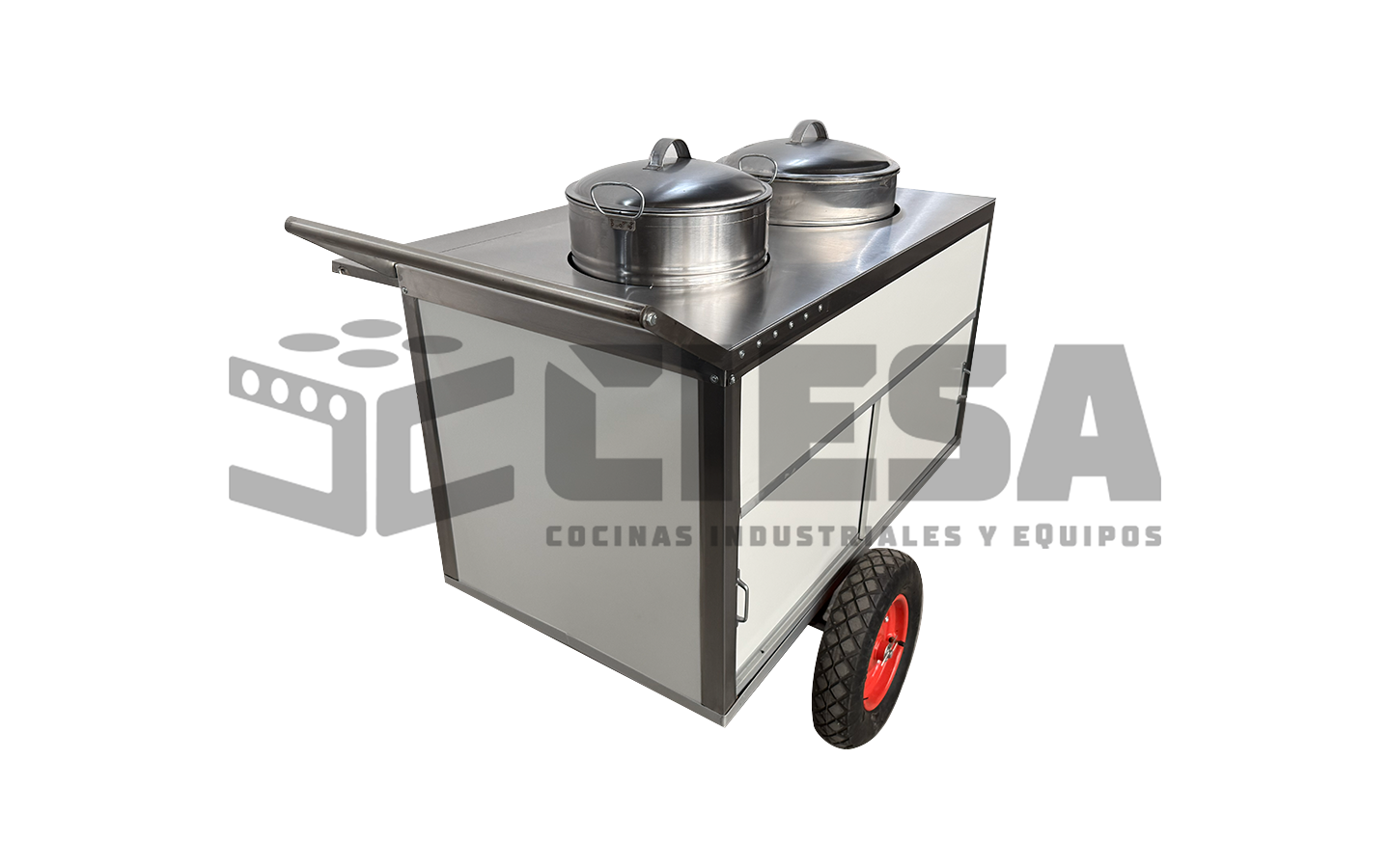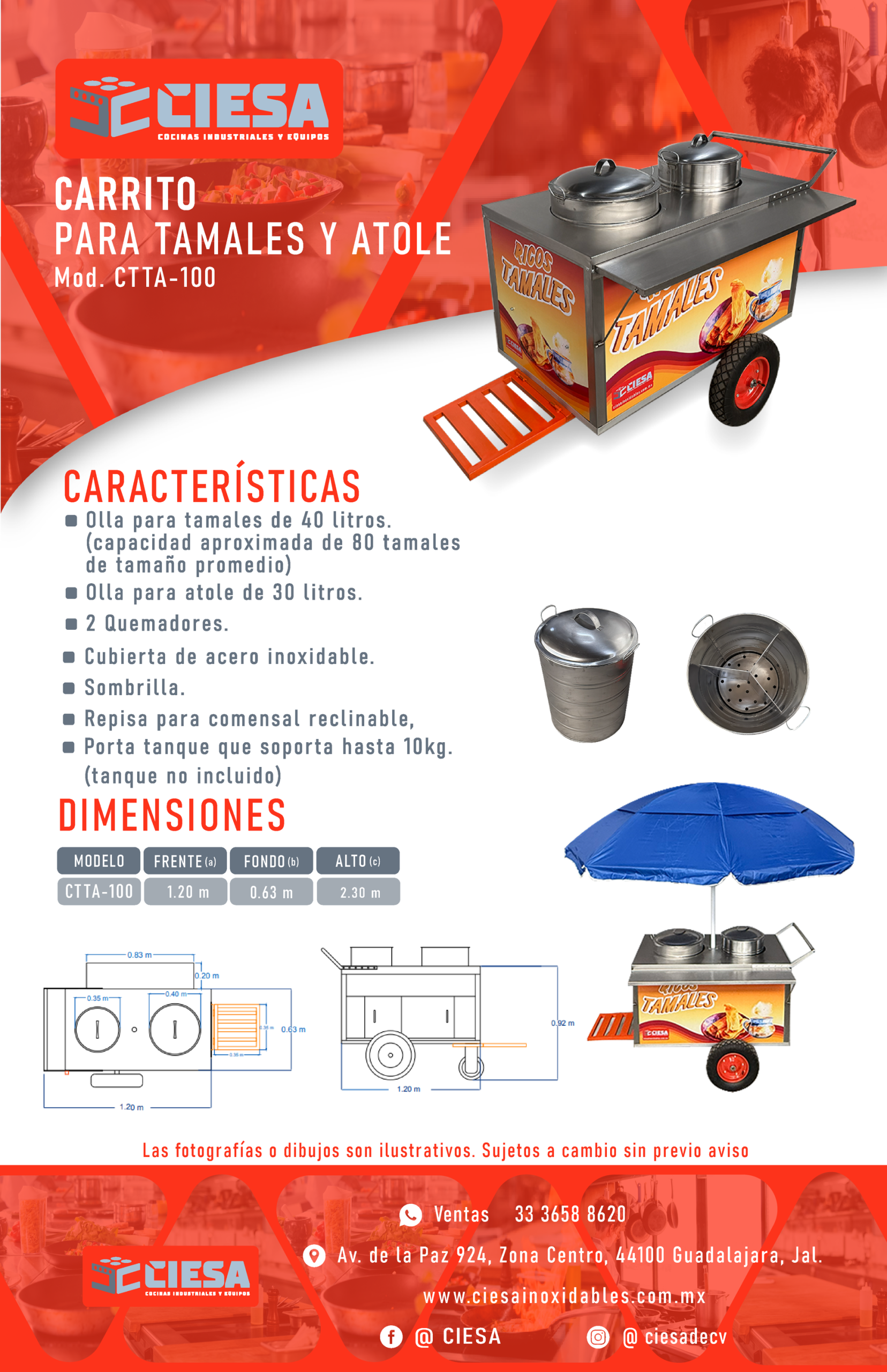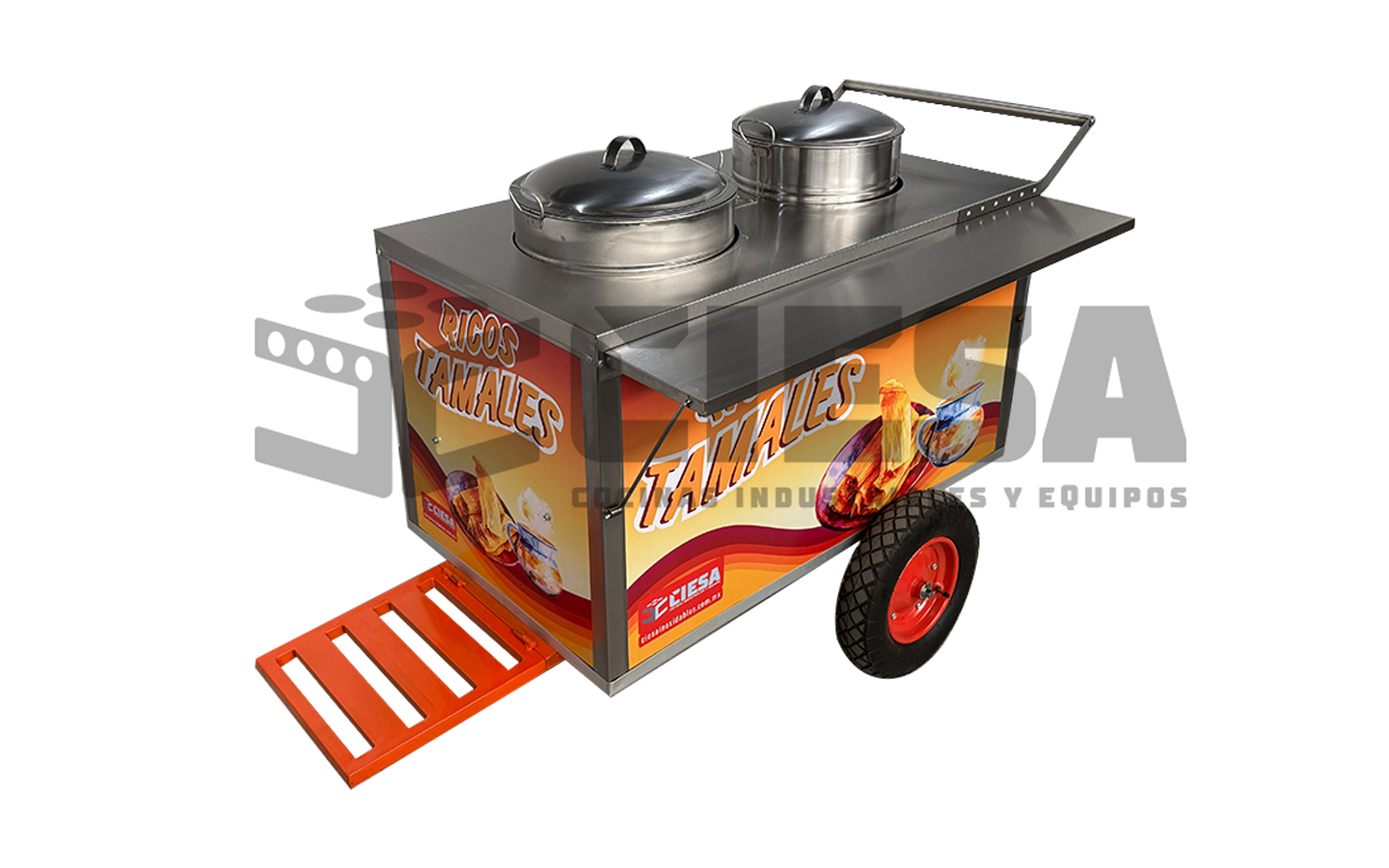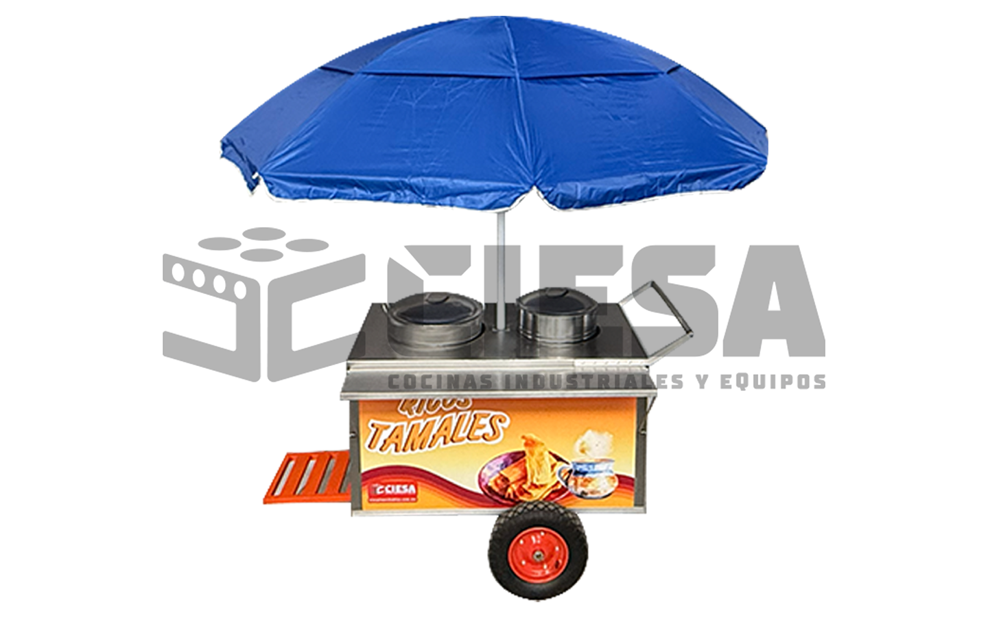 Nuestro carrito para tamales esta equipado con olla de 50 litros, 2 quemadores, cubierta de acero inoxidable, sombrilla integrada, repisa para comensal y porta tanque.