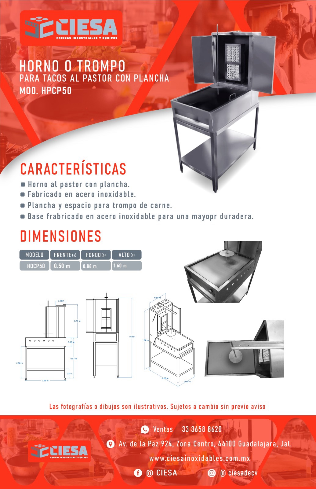 Fabricado totalmente en acero inoxidable, con plancha integrada y espacio para trompo de carne. Resistente, duradero y perfecto para tu negocio.